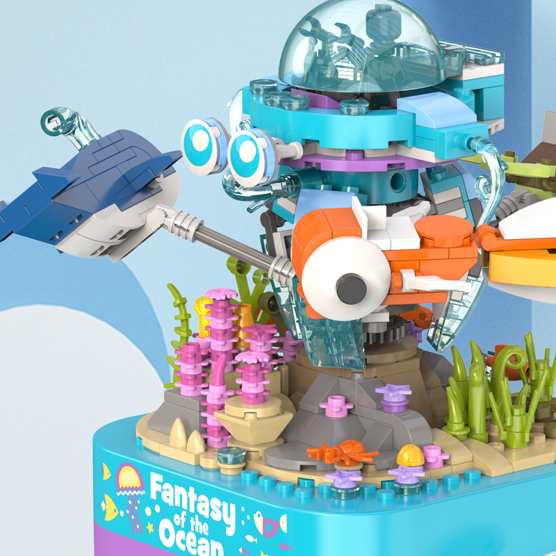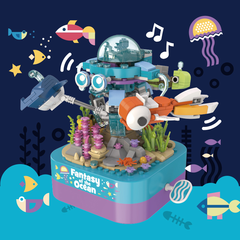 將積木與音樂盒完美結合,好玩又時尚。純機械動力設計更環保,音樂盒發條轉動帶動整個海洋館旋轉,益智拼搭,時尚美觀,還能充當家居精品擺件。